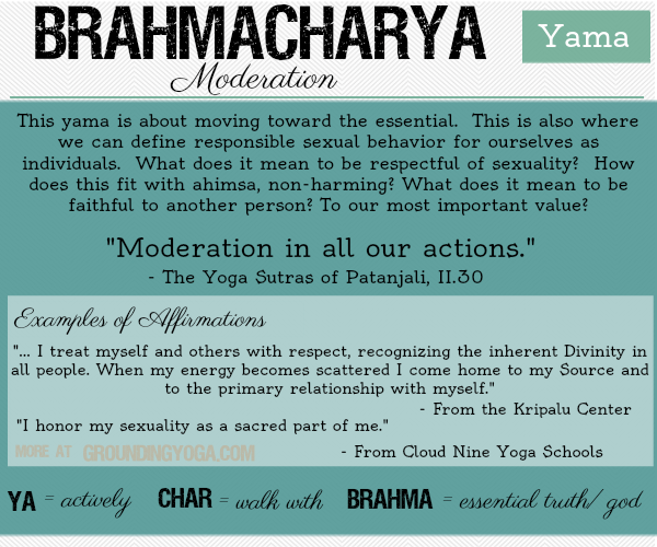 In looking at the way we interact and communicate with others, “brahmacharya” has many applications. We must choose how we wish to conduct ourselves in the world, and how we treat our bodies, from how we dress to what foods and drinks we consume (and how much!) Do we indulge too much, or do we deprive ourselves of any pleasure? Just as we work on balance in our asanas, we do so in this limb of yoga as well.
