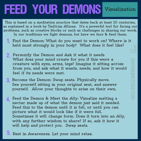 This exercise is part of week 4 of our study of creativity and yoga. I’ve simplified the language of the practice here for home use, but in class we’d go into further detail as a guided meditation. This practice comes to us from the book Feeding Your Demons: Ancient Wisdom for Resolving Inner Conflict. It describes a meditation practice recorded by Buddhists in the eleventh-century by the name of “Chod,” which means “to cut through.”