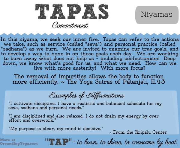 The niyamas are the second limb of yoga, found in a text called The Yoga Sutras of Patanjali. The translation that I used was from T.K.V. Desikachar in his book The Heart of Yoga. Tons of great sources are available online on the second limb of yoga…