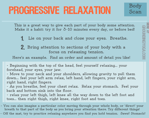 Progressive Relaxation is a common relaxation technique that involves what’s often called a Body Scan.