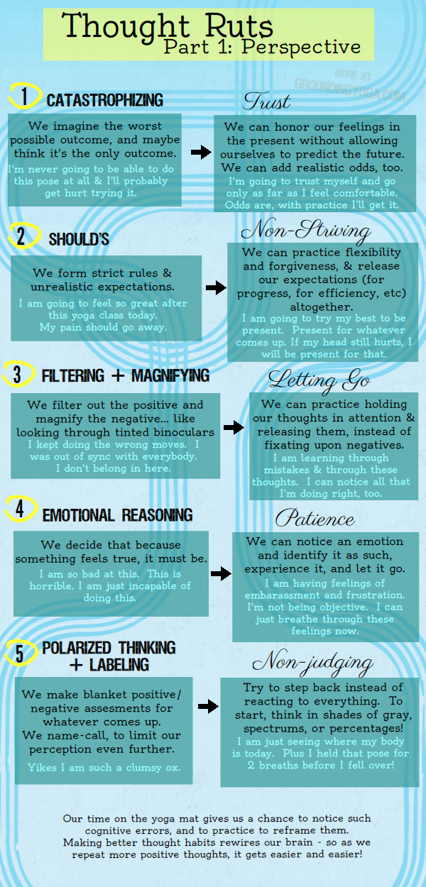 Here’s a take on cognitive errors mixed with some of the mental habits we try to cultivate through yoga– and mindfulness in general.
